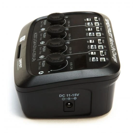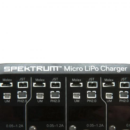 The Spektrumâ„¢ Micro 4 Smart charger is a 4-port tool for the RC pilot who wants the ultimate in 1S LiPo battery charging. Featuring Spektrum Smart Charging technology, its digital LED status screen delivers vital battery information in a clear manner the instant you connect. Its compact all-in-one design incredibly offers four independent charging channels, each with enough built-in connectors so that charging multiple 1S batteries with the highest level of precision is easy.