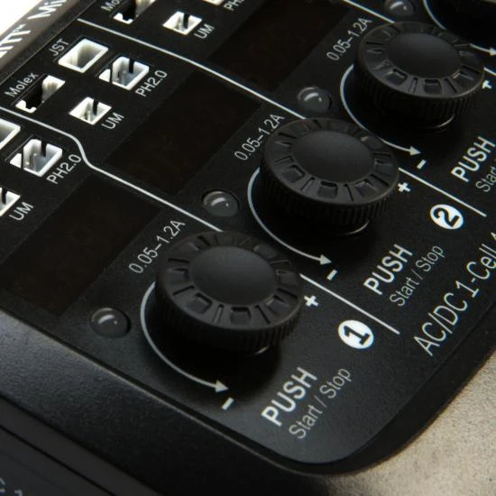 Four individual charge circuits and four separate charge ports make it possible to charge multiple 1S packs with precision. Choose the exact charge rate you need from 0.05 to 1.2 amps using the individual dials that combine with a 4-digit display and a multi-color status LED system so you can keep a fleet of batteries working hard for you.